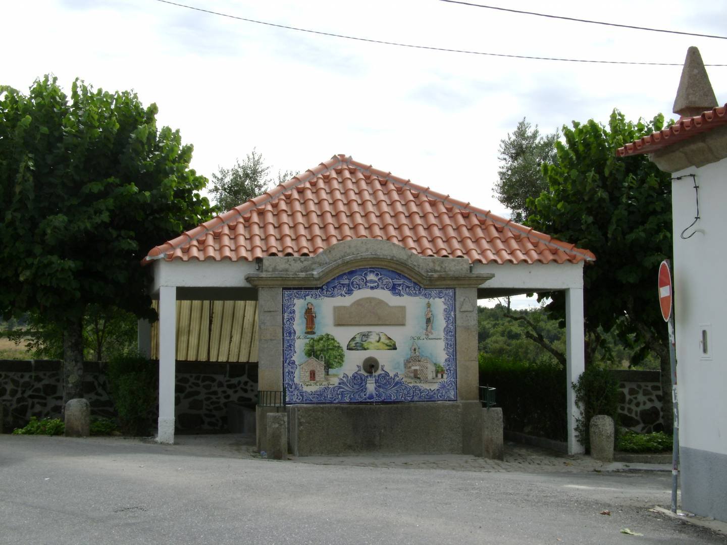 Fontanário de espaldar, com uma bica e um tanque retangular, onde se destaca um painel de azulejos.